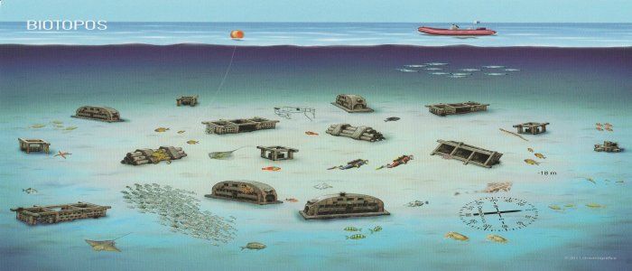 In front of the beach of “Montaña Arena”, at a depth of 23 m and on a sandy bottom, there are several tens of structures built in concrete, forming the artificial reef or biotope. It has 4 models that, grouped together, favor the proliferation of different species. The creation of this artificial reef was carried out in 1991 by the Government of the Canary Islands, under the follow-up by the University of Las Palmas de Gran Canaria.