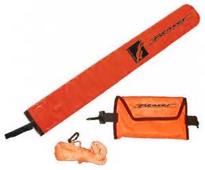 Tubos de señalización hinchables - Estos tubos hinchables brillantes de colores - normalmente naranjas o amarillos - se alzan a más de un metro/yarda de la superficie para hacerte más visible. Son equipo obligatorio en muchas zonas del mundo y altamente recomendado en todas partes. Se enrollan de forma compacta y se llevan en el bolsillo del chaleco cuando no se utilizan.
