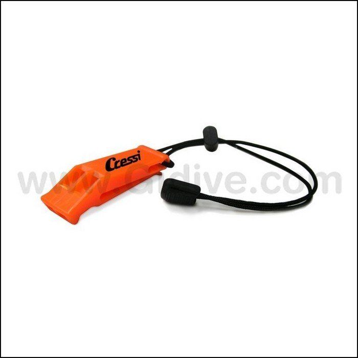 Silbatos - Un silbato, como el Silbato PADI, es pequeño, fácil de llevar y efectivo, lo que lo convierte en el dispositivo de señalización de superficie audible más común. Es una práctica estándar llevar tu silbato prendido en el latiguillo del hinchador del chaleco donde es fácil de localizar si se necesita. El sonido de un silbato bitonal viaja lejos sobre el agua.