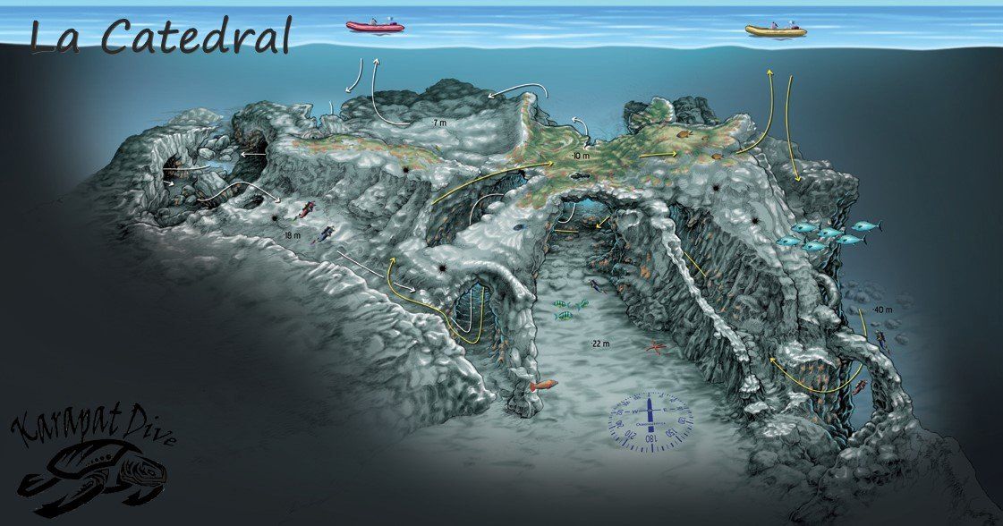 La inmersión ofrece uno de los paisajes submarinos más alucinantes de Gran Canaria. Frente a la costa de La Isleta a 25 minutos de navegacion del muelle deportivo se situa cerca de una pequeña península adosada a la ciudad de Las Palmas de Gran Canaria, en el nordeste de la isla– yace una enorme masa de roca volcánica de formas retorcidas, casi góticas, y plagada de cuevas, bóvedas, arcos, pasadizos y diques casi verticales. Este edificio submarino de más de 30 metros de desarrollo vertical deja sin aliento.